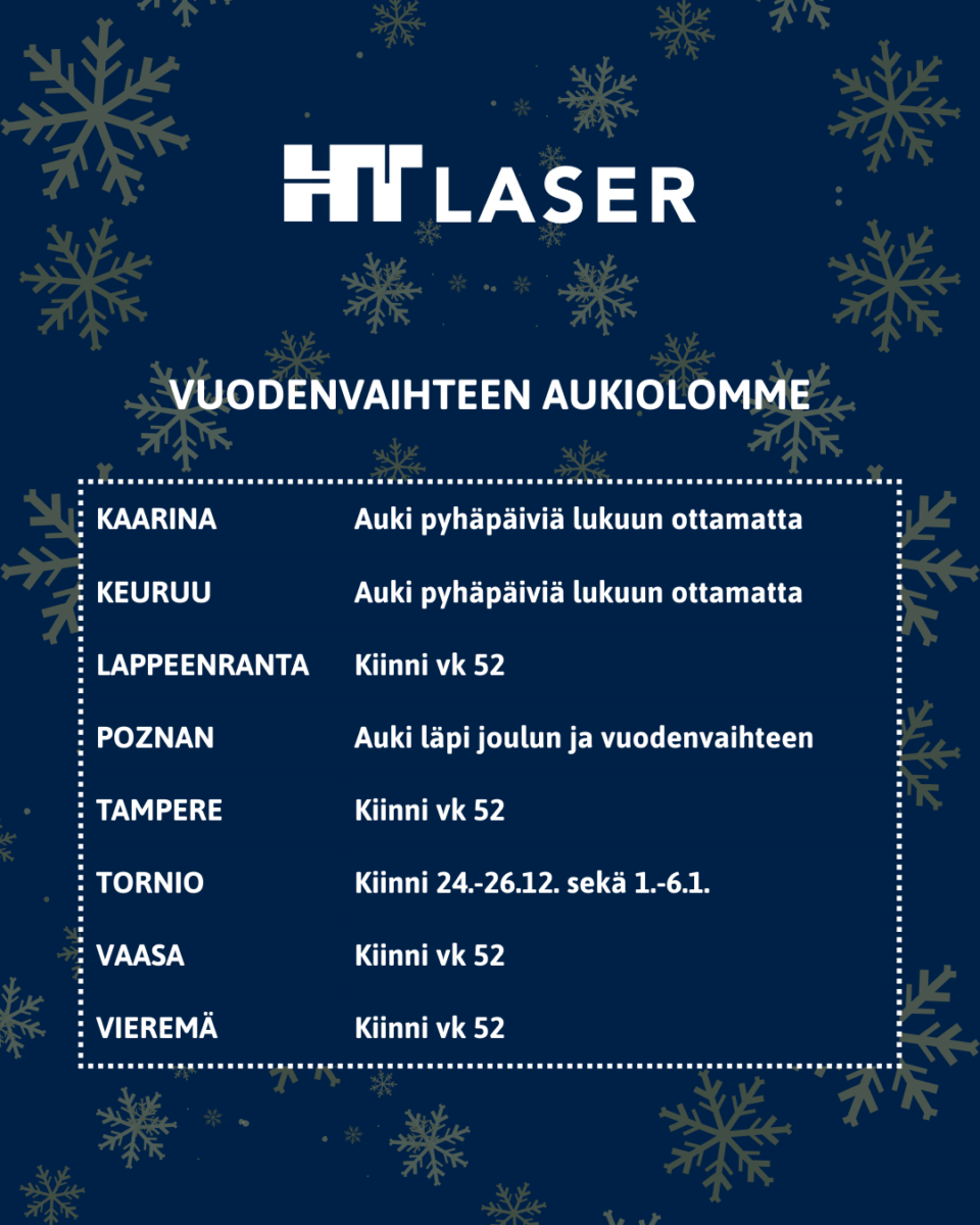 HT Laser on asiakasta lähellä. Palvelemme kahdeksalla paikkakunnalla Suomessa (Jyväskylä, Kaarina, Keuruu, Lappeenranta, Tampere, Tornio, Vaasa, Vieremä) sekä Puolan Poznanissa. Olemme kasvava perheyritys, vuonna 2022 liikevaihtomme oli 92,7 miljoonaa euroa. Työllistämme tällä hetkellä noin 450 teknologiateollisuuden ammattilaista. Kuulumme Nolla tapaturmaa -foorumiin ja olemme savuton työpaikka.