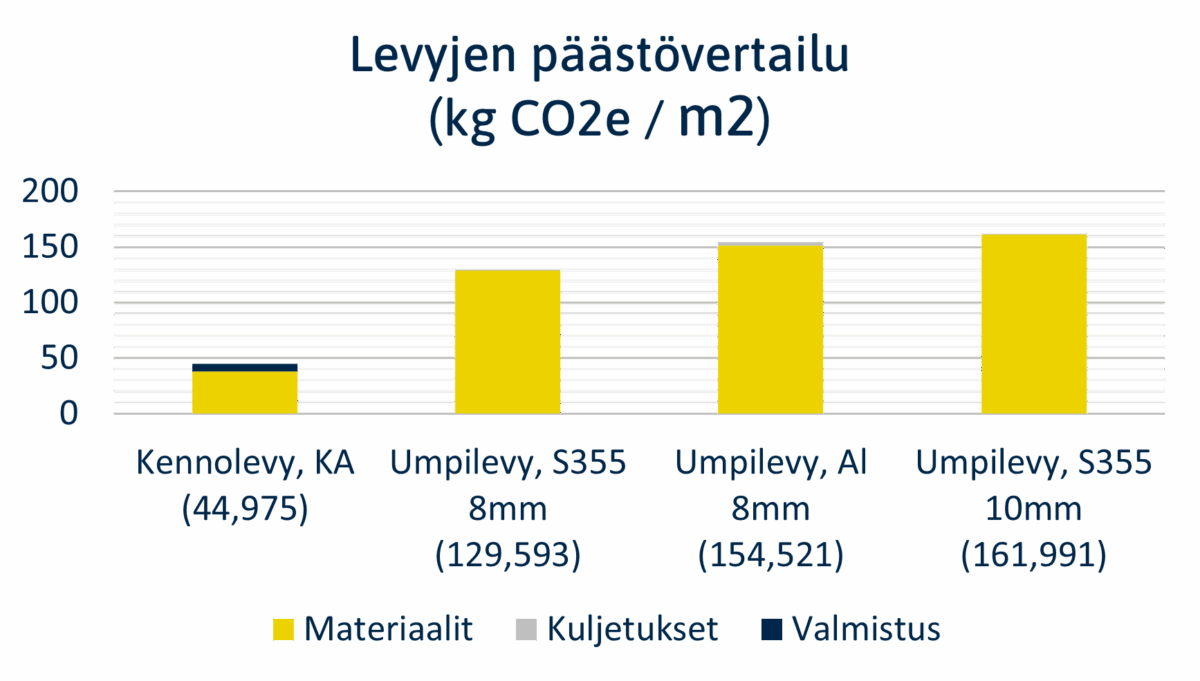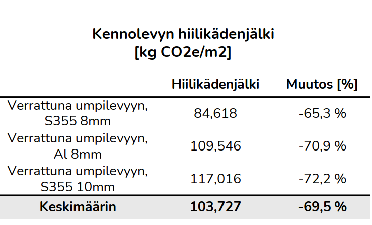 Kennolevyn hiilijalanjälki on keskimäärin 44,975 CO2e/m2, kun jännityskestävyydeltään vastaavan teräksisen 8 mm:n umpilevyn (S355) hiilijalanjälki on 129,593 CO2e/m2 (kuva 1). Näin ollen hiilijalanjälki on teräskennolevyllä vähintään 65,3% pienempi, ja muiden verrokkiumpilevyn kohdalla ero on yli 70%. Suurin selittäjä pienemmälle hiilijalanjäljelle on materiaalin vähäisempi kulutus: verrattuna verrokkiumpilevyihin, kennolevyn materiaalinkulutus on keskimäärin 68 % vähäisempää.