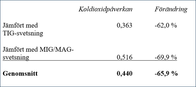 Detta innebär att koldioxidavtrycket för manuell lasersvetsning är i genomsnitt 0,440 kg CO2 lägre per svetsad meter jämfört med traditionella svetsmetoder. Jämfört med TIG-svetsning är koldioxidavtrycket 0,363 kg CO2 lägre per svetsad meter och jämfört med MIG/MAG-svetsning är koldioxidavtrycket 0,516 kg CO2 lägre per svetsad meter. (se tabell nedan)