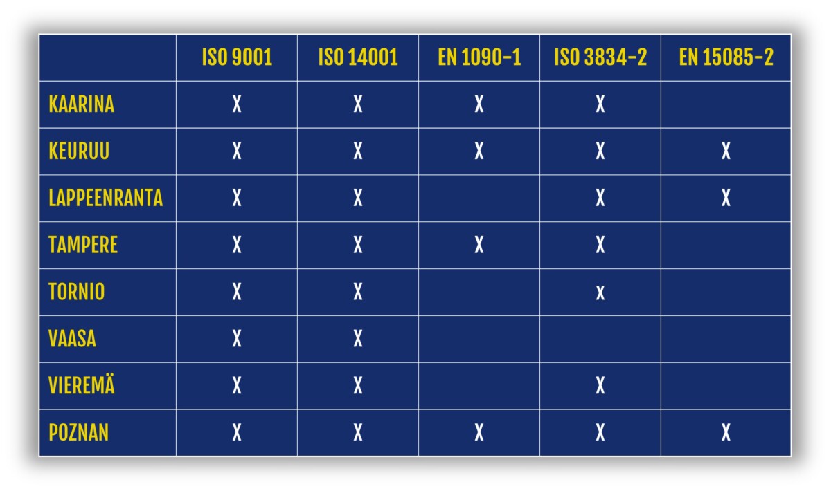 Vår verksamhet styrs av certifierade kvalitets- och miljösystem och våra produktionsenheter har ett gemensamt avvikelsehanteringssystem som vi använder för att övervaka interna och externa avvikelser i vår produktion. Vi analyserar regelbundet grundorsaker för att kunna utveckla vår verksamhet.